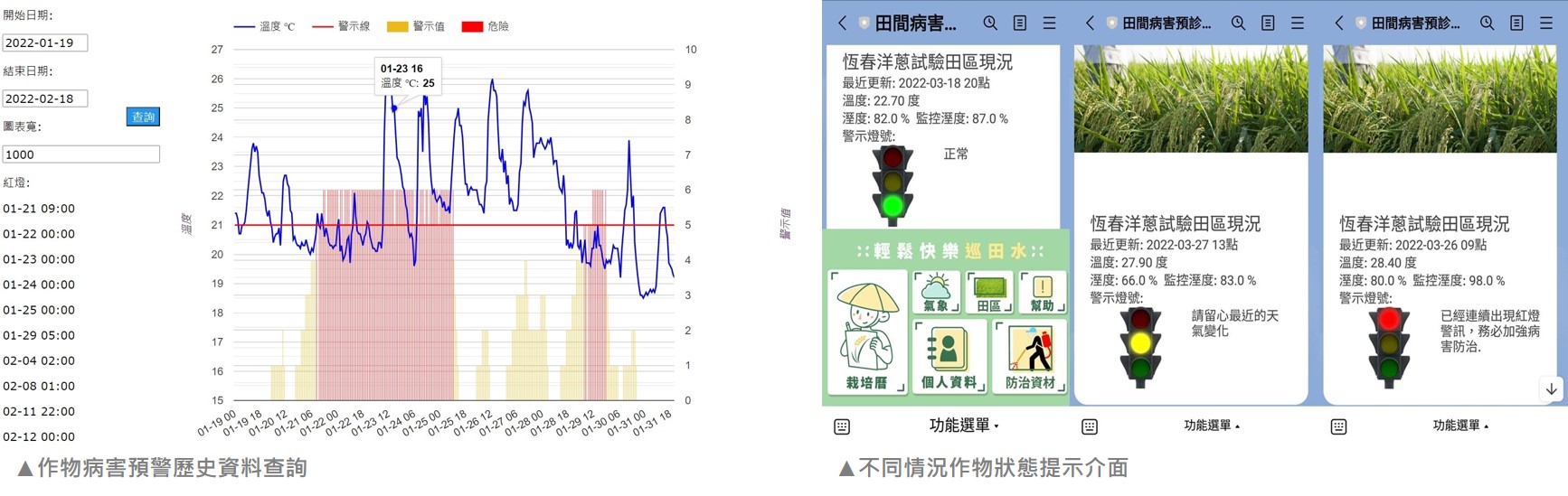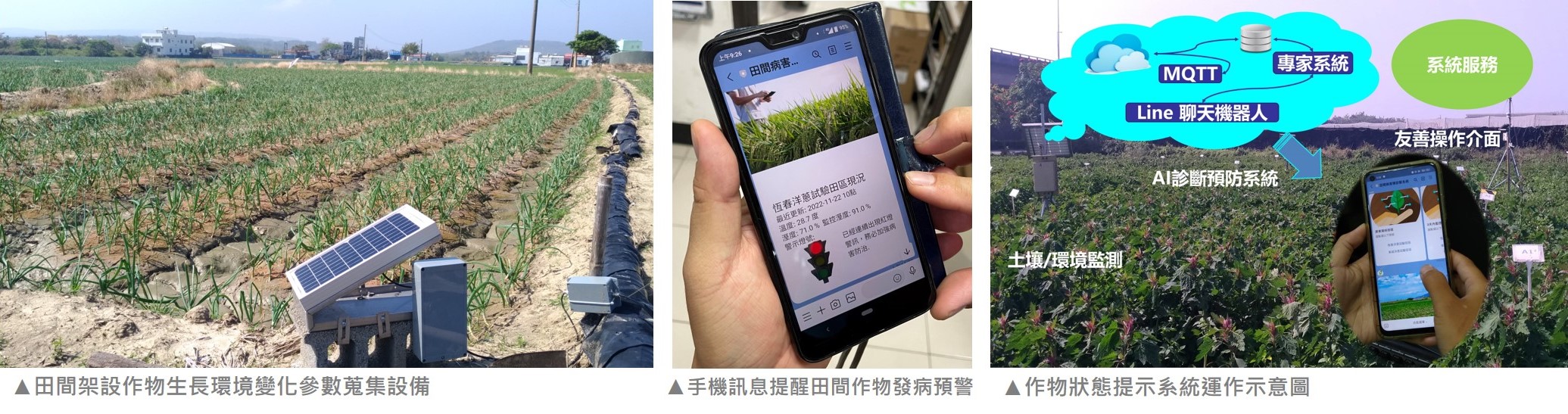 氣候變遷致使作物病害頻頻發生,農民收益降低。解法在於如何即時提示作物狀態,提醒農民病害預防則能降低損失。本系統藉由收集作物生長田區環境變化參數及作物發病的學理基礎,結合田間實際病害調查,建立作物發病專家系統,再提供系統智能化學習,進行作物發病機率預測,即時提醒農民病害防治降低農損。