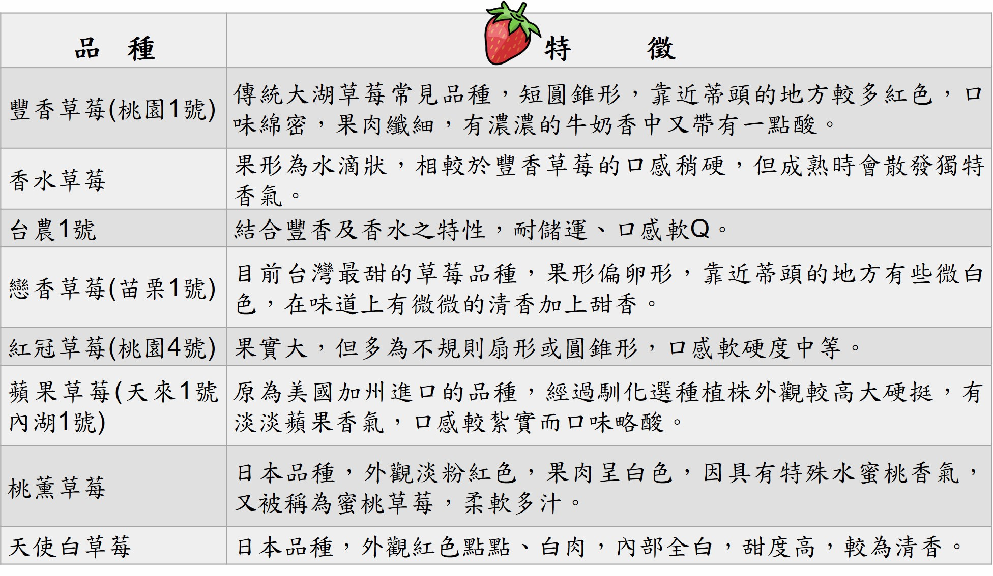 ▲表1、臺灣目前市面上草莓常見品種.jpg