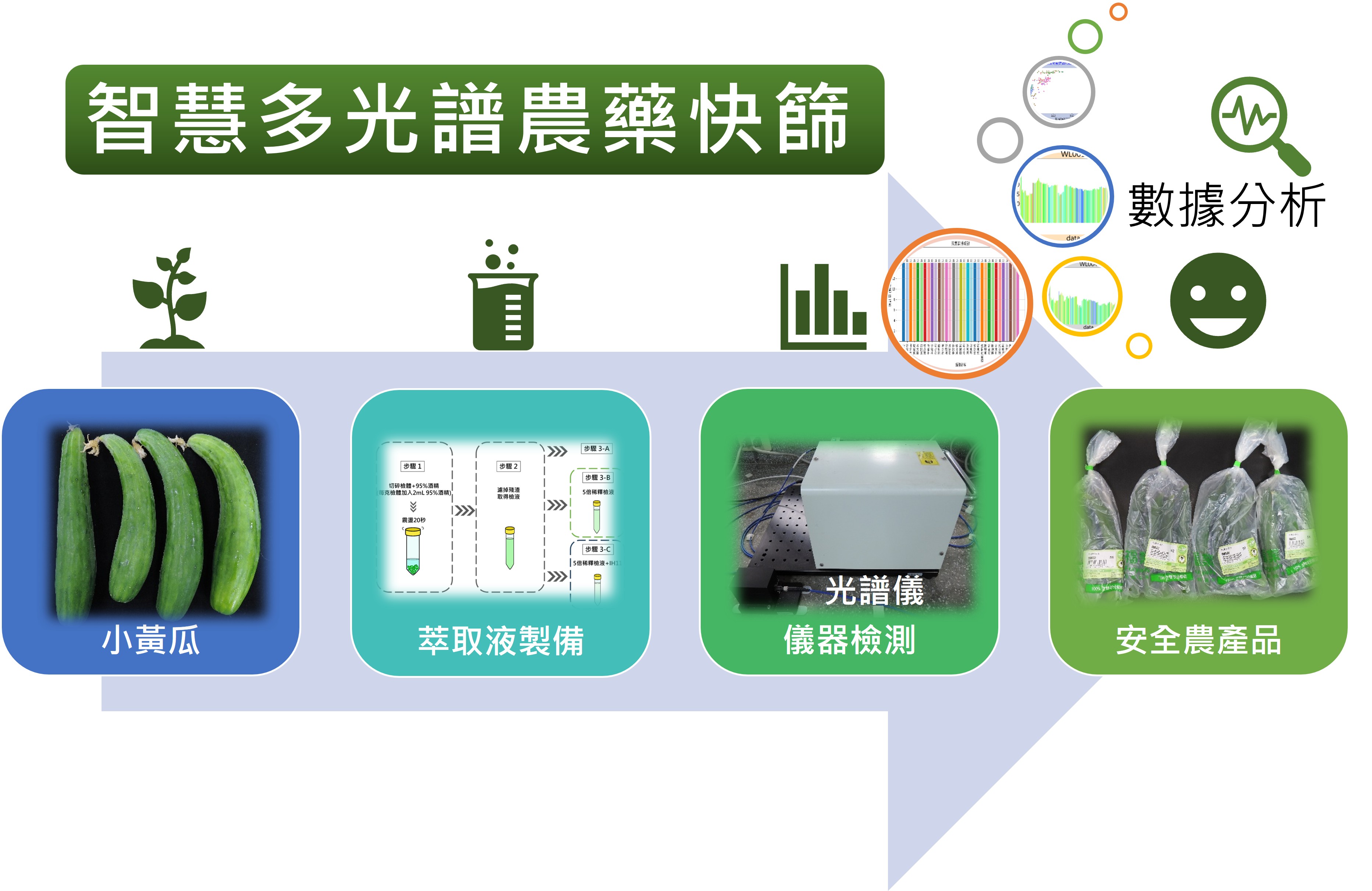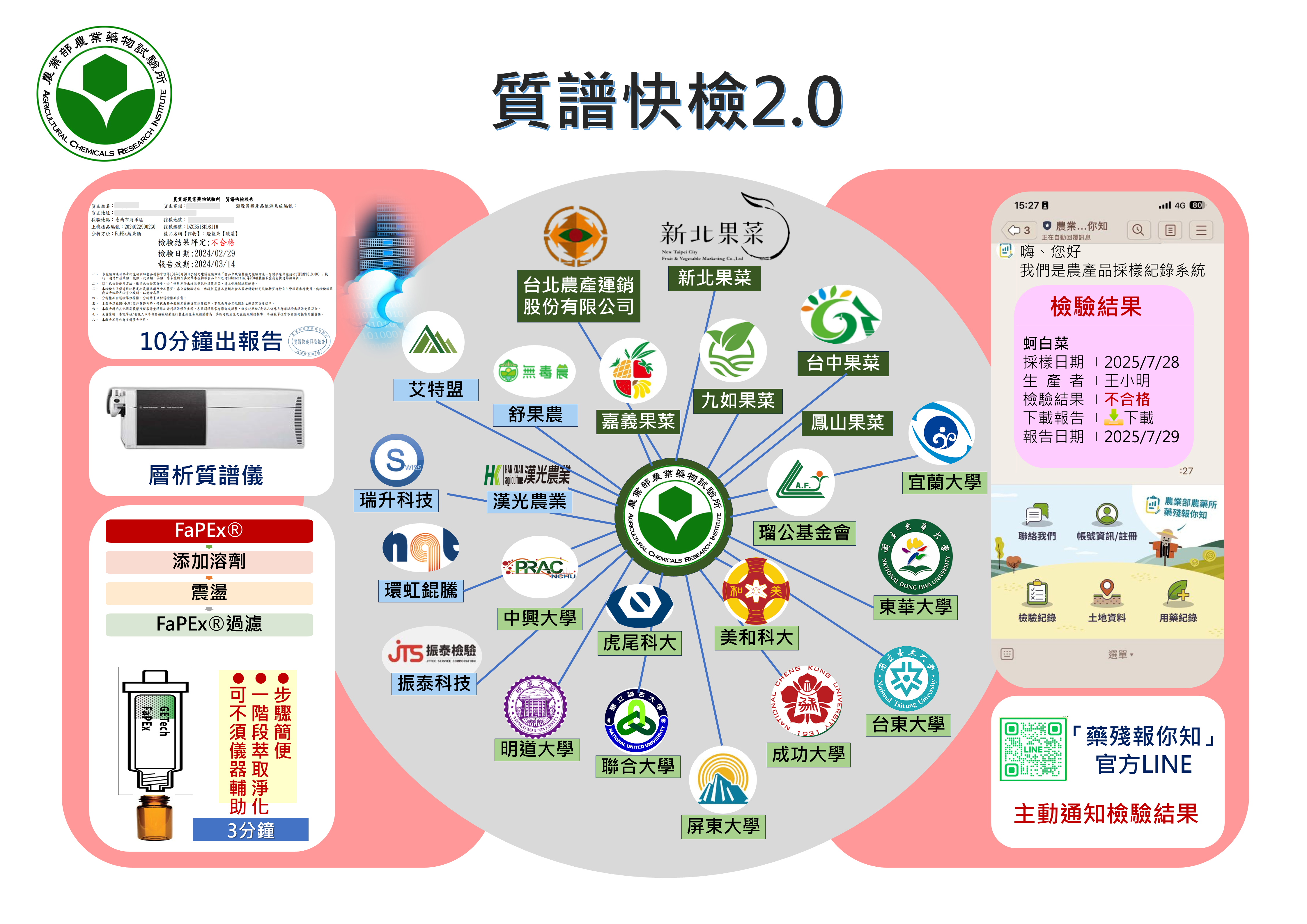 建構「質譜快檢2.0」,提升定量精準度,並優化AI自動分析平台,加速農藥檢測圖譜判讀,可於10分鐘內出具檢驗報告,減輕人力負擔,提升檢驗效率,保障食安與推動智慧農業。