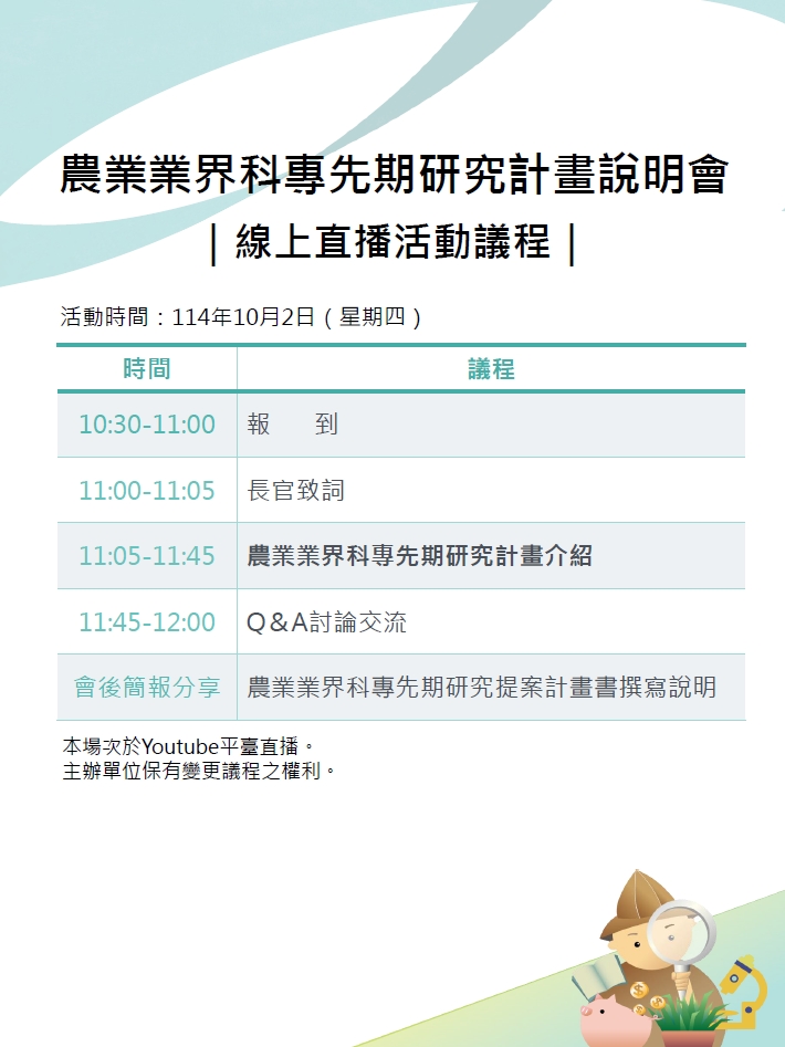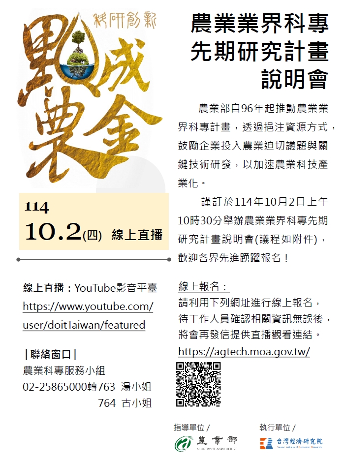 謹訂於114年10月2日上午10時30分舉辦農業業界科專先期研究計畫說明會(線上直播,議程如下),歡迎各界先進踴躍報名!