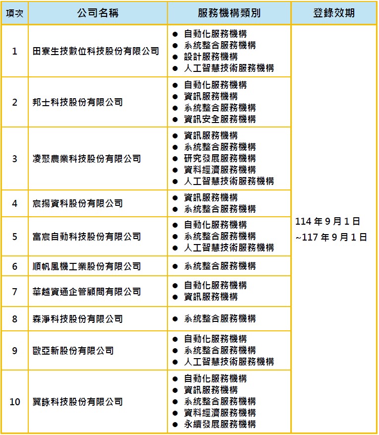 ::: 首頁 最新消息 114年度「智慧農業科技服務機構能量登錄」展延通過名單 發布日期:2025-09-08 點閱次數:7 為協助農事生產者得以找到合適的智慧農業解決方案,農業部推動「智慧農業科技服務機構能量登錄」機制,鼓勵具備農業服務能量的優質資服業者申請取得登錄資格。本(114)年度針對登錄效期已屆期之業者進行展延申請、審查,目前已完成相關作業,取得展延登錄資格之名單如下:(依公司名稱首字筆畫排列) 聯絡資訊: 執行團隊:台灣經濟研究院–農業物聯網推動小組 電話:02-2586-5000分機656 鄭先生 回前一頁