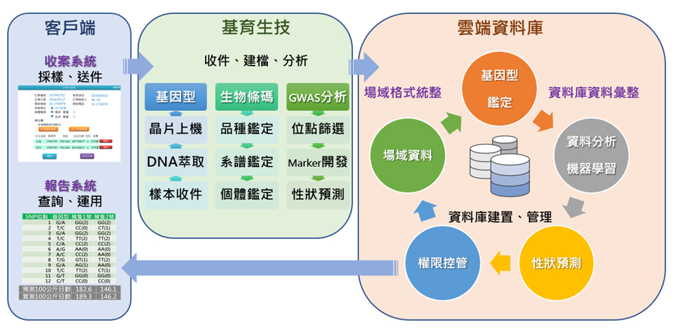 農業基因體則包含了基因體服務與基因體資料庫,基因體服務提供各式基因體定序與鑑定的服務,同時也提供重要經濟物種種原DNA萃取與保存的服務,收集到的基因體資料則匯入基因體資料庫中進一步管理與分析,並以數值化、簡單明瞭的指標供農場或飼養場使用,達成技術面上更為全面的基因型判別+性能評估分析一貫化服務,整合成為「農業基因資料加值平台」,讓沒有生物資訊專業背景的使用者能夠使用。提供應用服務包含:
