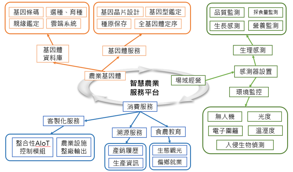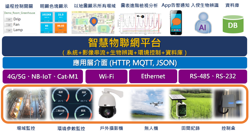 - 感知監測、資料收集/管理、雲端儲存、大數據分析、決策應用平臺(含預警、農務管理、客戶管理)、人機輔具(省工省力設備)
