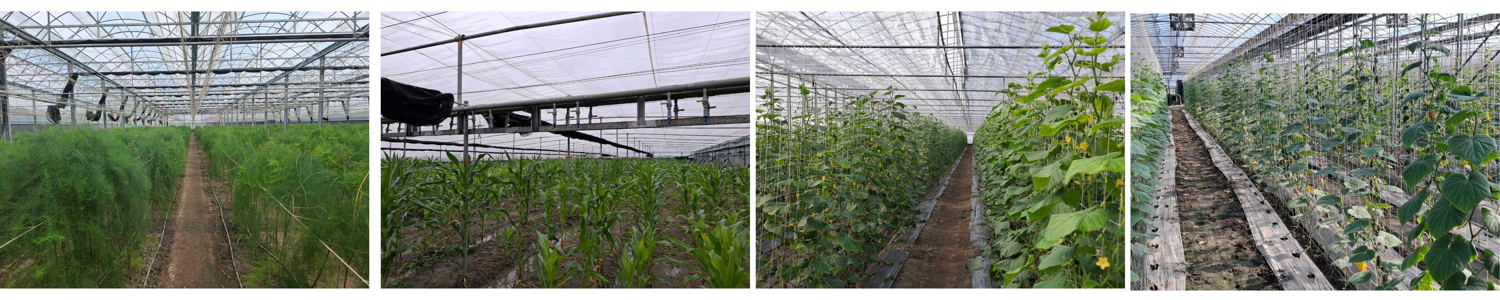 (1)地植型骨架設施:採用穩固的連棟溫室結構,專為地面耕作設計。結構高度與空間設計考慮到小黃瓜的攀爬生長特性及草莓的低矮栽培需求。