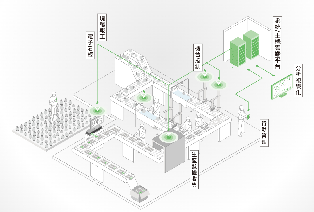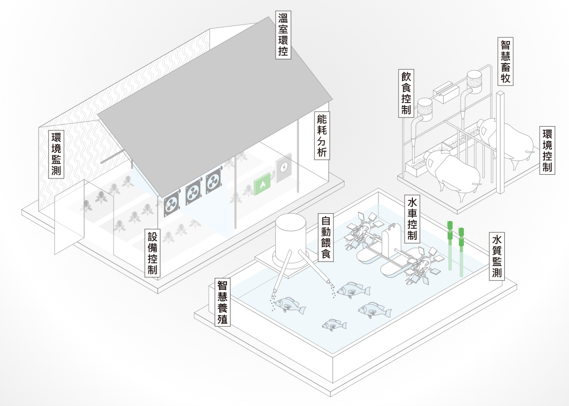 - 感知監測、資料收集/管理、雲端儲存、大數據分析、決策應用平臺(含預警、農務管理、客戶管理)、自動化控制、履歷/溯源管理