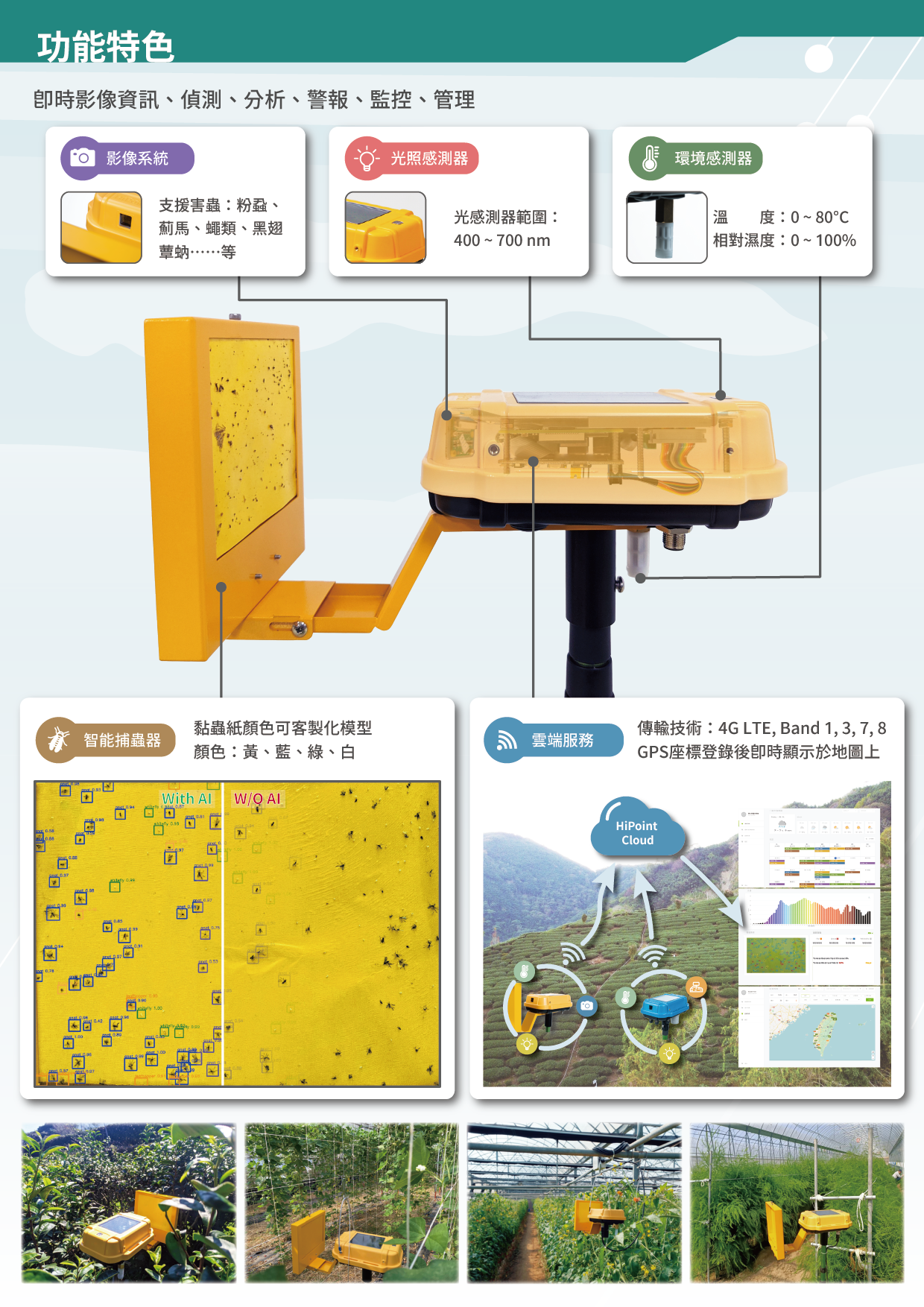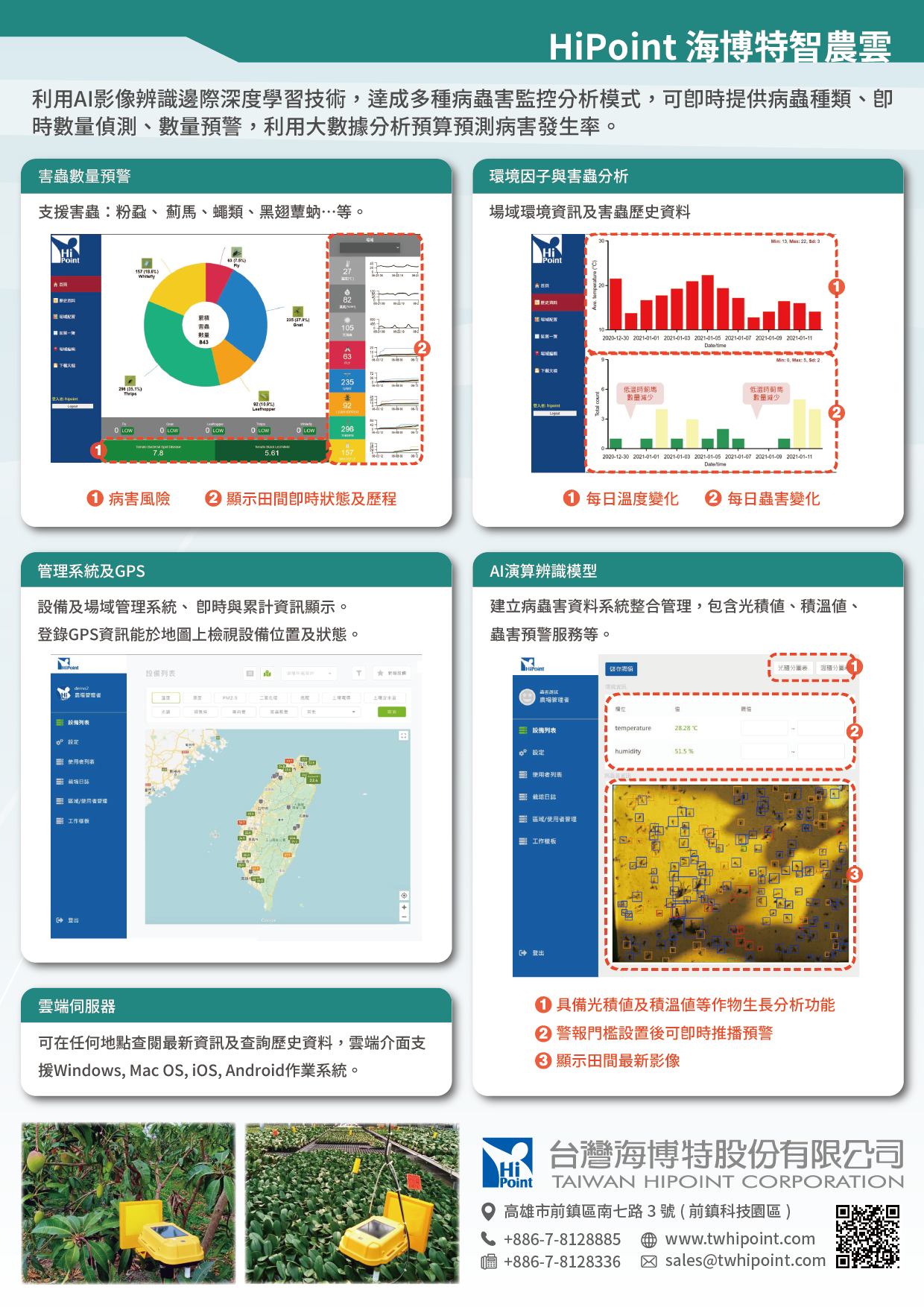 台灣海博特公司主要從事可環境控制模擬的植物生長監控設備系統與智慧農業監測系統的開發與製造銷售一條龍的專業製造廠,並以「高度客製化、彈性機電整合」為特色,以自有品牌「Hipoint」行銷,產品有氣候模擬的植物成長箱設備、人工氣候模擬室、多光譜植物光源系統與植物影像分析系統等設備,公司近年積極推出具有影像AI辨識與雲端演算功能,並建置雲端數位服務平台,目前推出的智慧農業監測系統包含「病蟲害監測系統」與「微氣候環境監測系統」等產品。這些AI科技智慧產品,在台灣經濟研究院的輔導下已申請登錄農業部「智慧農業科技服務機構能量登錄」;「病蟲害監測系統」產品並於110年6月30日報名台灣精品獎選拔。