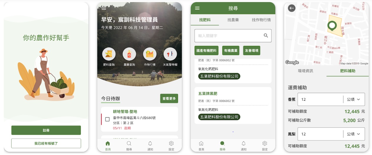 為倡導環境友善耕作,本APP提供農企業簡潔友善介面,整合市場拍賣價格、農業氣象、肥料與農藥購買補助等最新資訊,系統背後同時整合RTK(高精度定位),AI影像判識等技術自動為農場提供精準管理建議並紀錄減碳效益。