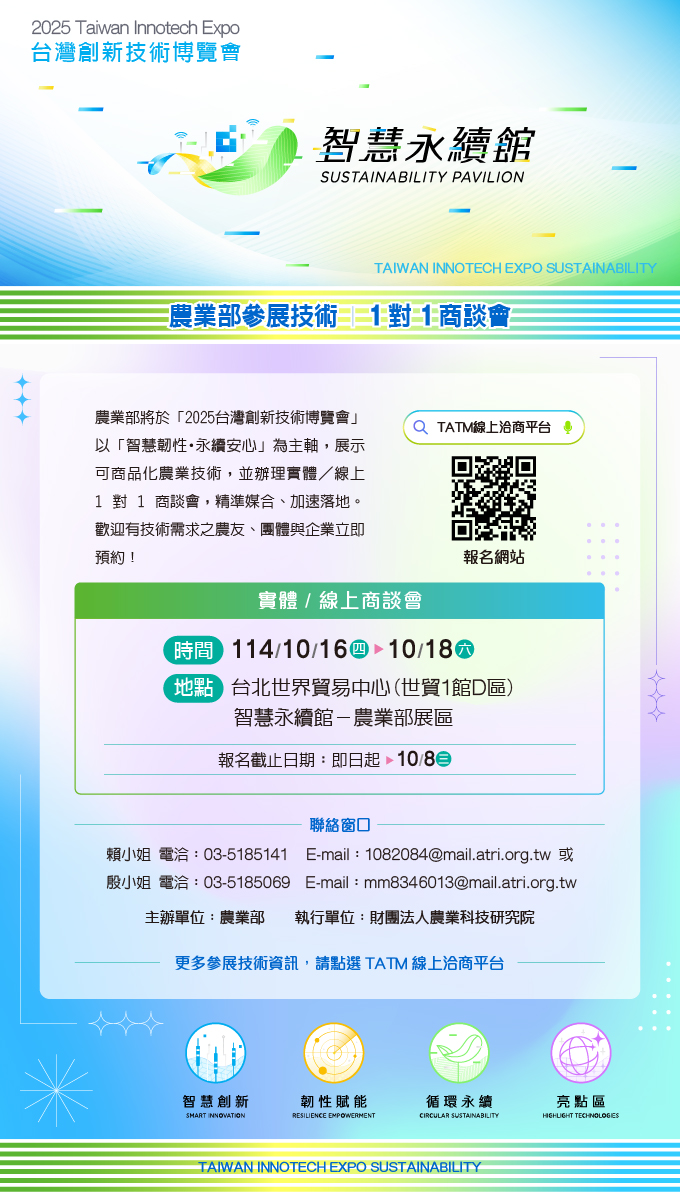 為提供農業最新研發技術及共商合作契機,農業部將於「2025台灣創新技術博覽會_智慧永續館」以「智慧韌性 永續安心」為主題,規劃「循環永續」、「韌性賦能」及「智慧創新」三主題區,展出具商品化潛力之科技研發成果,並於展期間同步舉辦「1對1商談會」,由技術專家與有興趣之業者進行面對面洽談,以期推動研發技術成果產業化,協助產業持續創新及提升企業競爭力,誠摯邀請有技術需求之農友、單位團體及企業共襄盛舉!機會難得,歡迎參加!