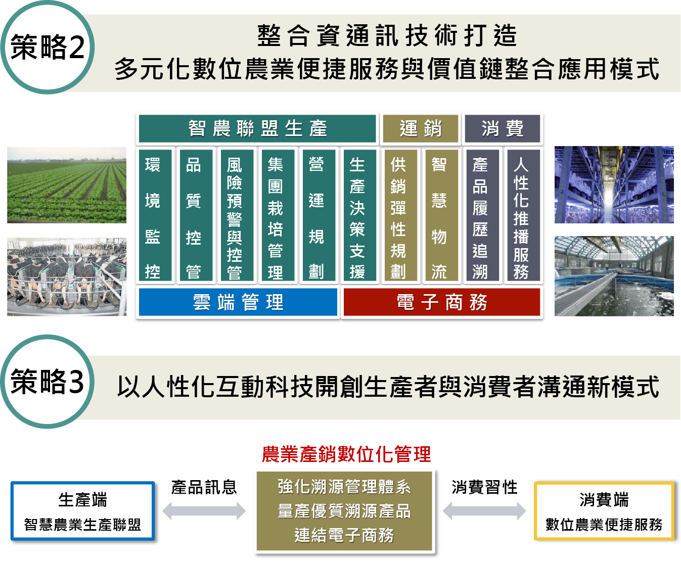 以現行產業生產模式為基礎,因應消費市場需求進行產銷規劃,生產管理上輔以省工省力機械設備、輔具及感測元件的研發應用,並結合跨領域之資通訊技術(ICT)、物聯網(IoT)、大數據(Big Data)分析、區塊鏈(Block Chain) 等前瞻技術導入,減輕農場作業負擔降低勞動力需求,提供農民更有效率的農場經營管理模式,生產符合消費者需求,安全、安心及可追溯的農產品。
