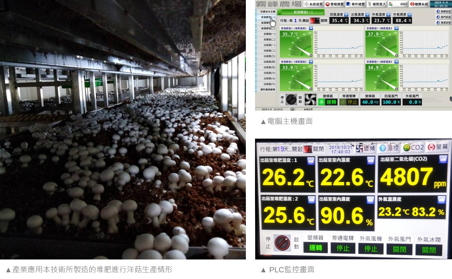 為改善傳統洋菇產業堆肥的製作發酵模式耗工、耗能、產量低、品質參差不齊的問題,行政院農業委員會農業試驗所研發多階段均溫製程智慧化韌體系統,對供氣及循環系統整合環境感測及監控元件,利用比例微積分(PID)模組技術,結合菇類堆肥室內發酵技術,降低空氣污染、提高堆肥品質、縮短製作時間與穩定產量,讓洋菇堆肥發酵製程獲得精準的智慧化控制,將所製造的優質堆肥使用於業者場域,實施全年穩定化的洋菇生產。