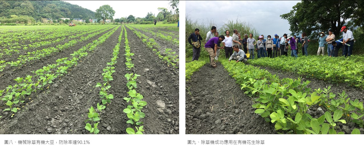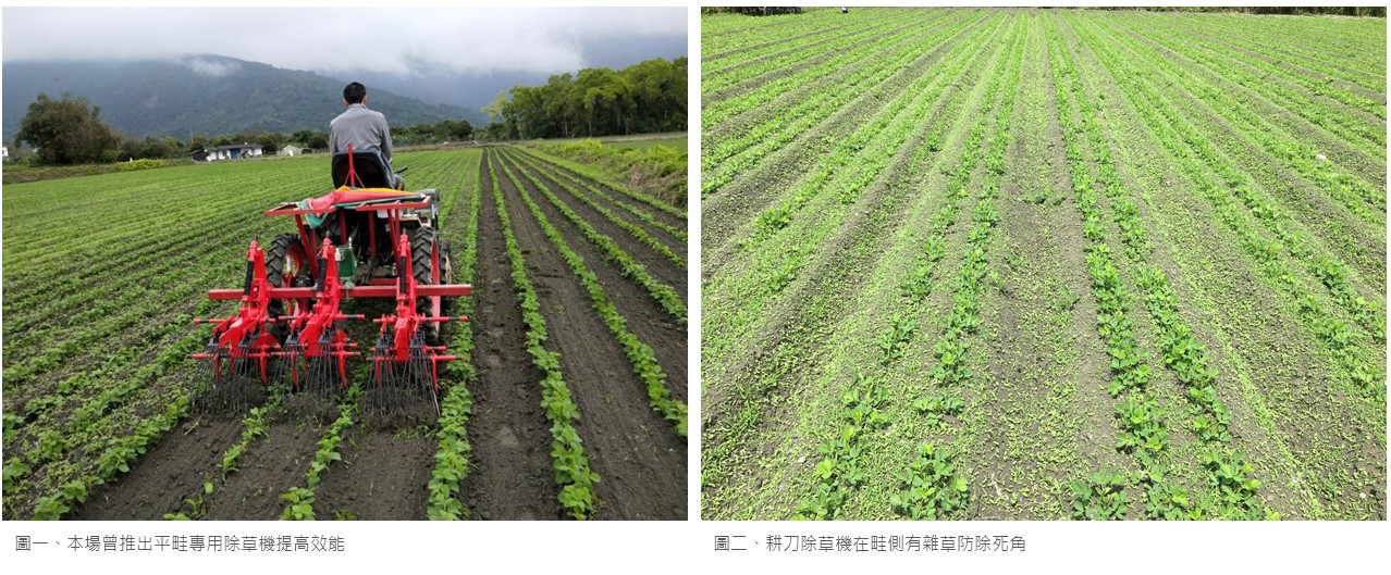 雜草管理是有機栽培的關鍵技術之一,尤其花蓮春作氣候晴雨交替,當氣溫逐漸上升,效率不彰的除草方式往往趕不上野草的生長勢。「附掛式畦間中耕除草機」的研發補足了有機大豆作畦栽培的機械除草缺口,提供有機農場雜草管理的新選擇,同時也讓花生有機栽培機械化露出曙光。採慣行栽培的農場也可選擇機械除草降低除草劑的使用。新型除草機的推出不僅可以減輕農友辛勞、降低人力成本,同時也可支持有機友善、農藥減半及永續農業等農業政策。