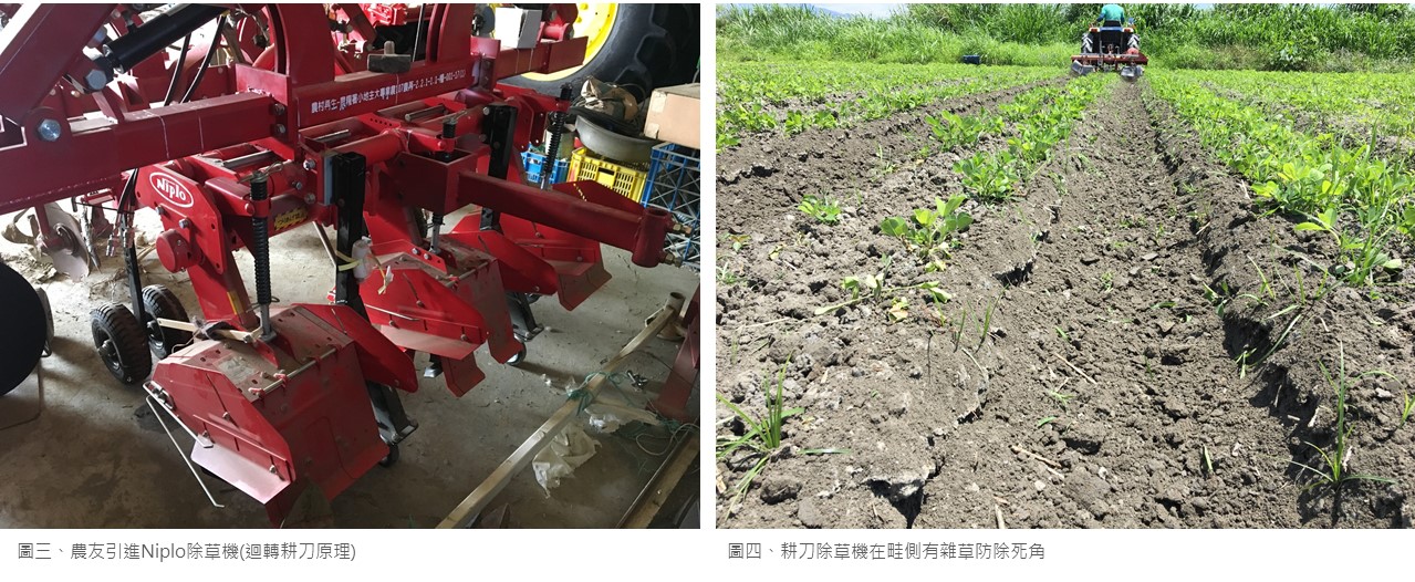 作畦栽培規格的除草機械有迴轉耕刀型和圓碟犁型2種,農友們分別引進日本Niplo及Iseki的除草機使用。迴轉耕刀型以曳引機動力旋轉,切削表土除草,能應付各種草況和土壤質地。不過迴轉耕刀除草在畦側會有死角無法防除,此外田間若有石礫,耕刀也有斷裂的可能。圓碟犁型式比較貼近畦的形狀,在畦底和畦側都有不錯的防除效果,而且較能耐受石礫撞擊,此外拖曳作業的工作效率也比耕刀型快3倍以上。但目前引進的兩種除草機都只能使用在畦間除草,涵蓋範圍只有需要除草面積的一半不到,畦面的雜草還是無力防除,只能仰賴人力補足。