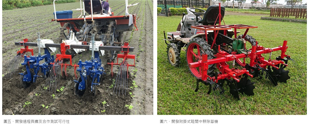 在反覆田間測試之後終於完成「附掛式畦間中耕除草機」的開發。機械完整涵蓋畦面、畦側及畦底的空間,並且能避開植株,達到細膩的、立體化的中耕除草效果。機械同時採模組化設計,可配合4行或6行真空播種機的規格。除草機依著播種機的規格和路徑除草,就不必擔心因為播種時交錯行的寬窄不一,造成機械除草的損傷率太高的困擾。