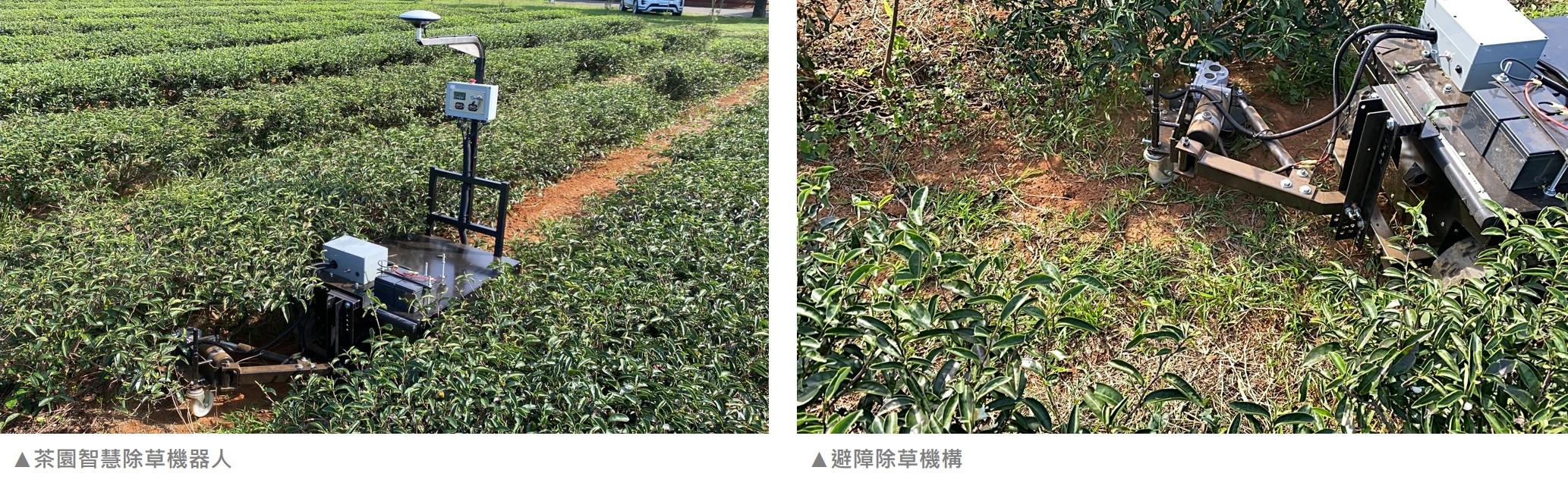 雜草防治是茶園管理的主要工作之一,現行茶園多仰賴人工除草,約占茶園管理成本 30% 左右,又以有機茶園因為無法使用除草劑,人工作業成本又更高。結合 RTK 無人車及避障除草機組研發而成的「茶園智慧除草機器人」,自動在茶樹間行走除草。