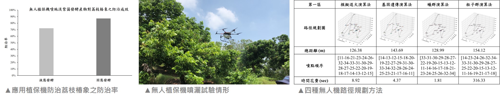 1. 透過植保機施灑之精準劑量及蟲生真菌之防治應用,荔枝椿象防治率可超過 90%。
