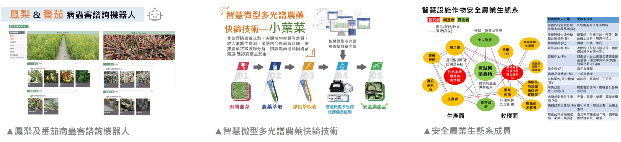 為落實「建構完善的農作物智慧生產生態系計畫」目標,提出兩項智慧科技應用主軸,包括生產面所需「提升有害生物自主管理之技術服務」;收穫面所需「農產品農藥殘留檢測把關技術」。透過公部門技術整合,針對農政與產業需求,提供即時、精準與公私協作的技術整合、技術落地、問題回饋與應用技術再優化,建立穩定的公私協力夥伴關係,並將整合過程所需注意之相關問題,提供農政機關參酌與研擬相對應的政策配套工具。