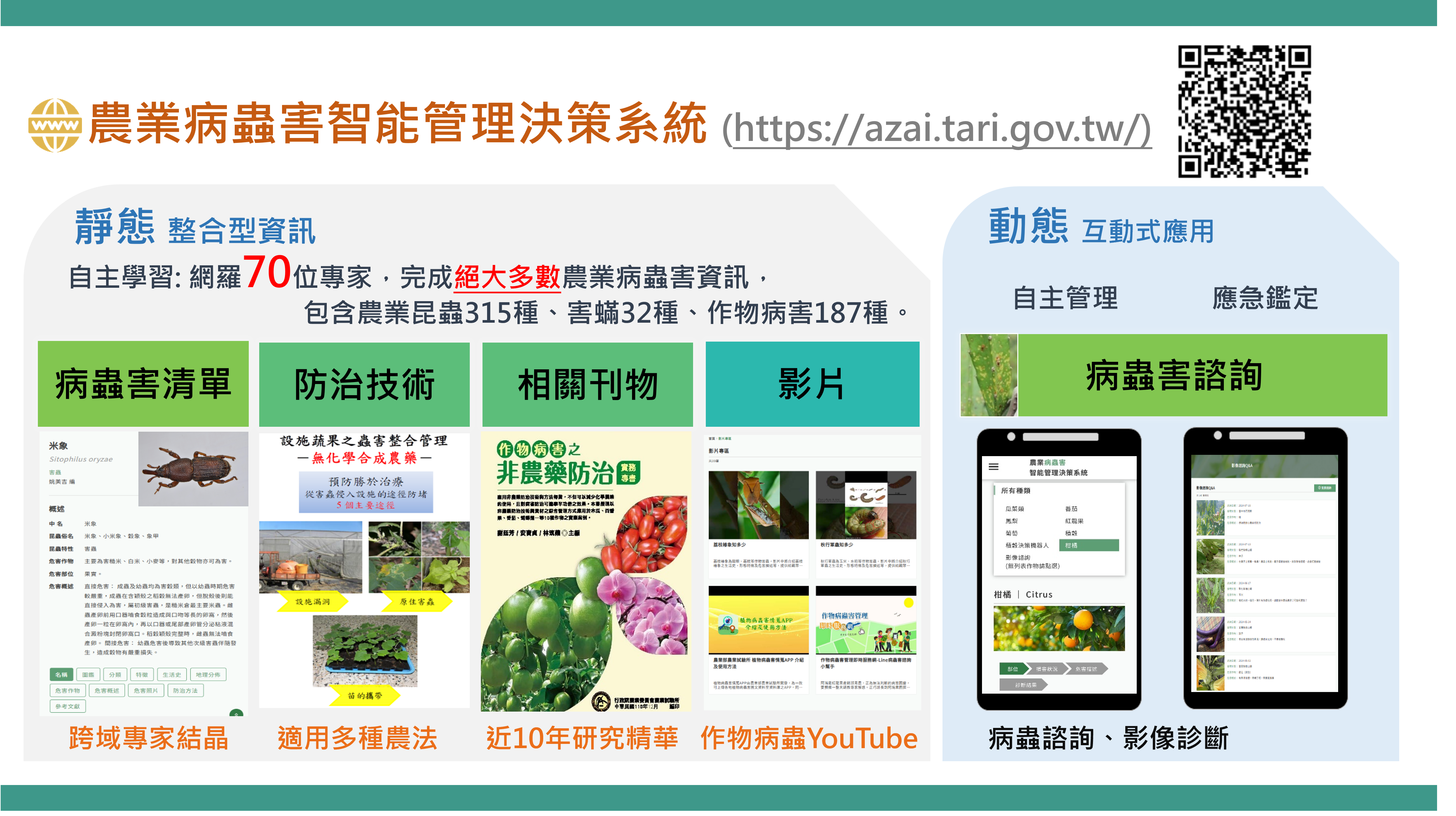 協助農民自主判斷病蟲害並採取防治措施,同時亦開發Line病蟲害諮詢小幫手與病蟲害情資蒐集APP,前者能分析聊天並推播資訊,後者記錄病蟲害發生資訊,提升田間診斷效率與農業安全。